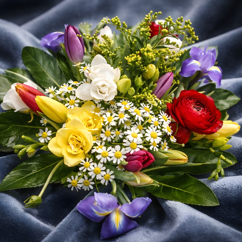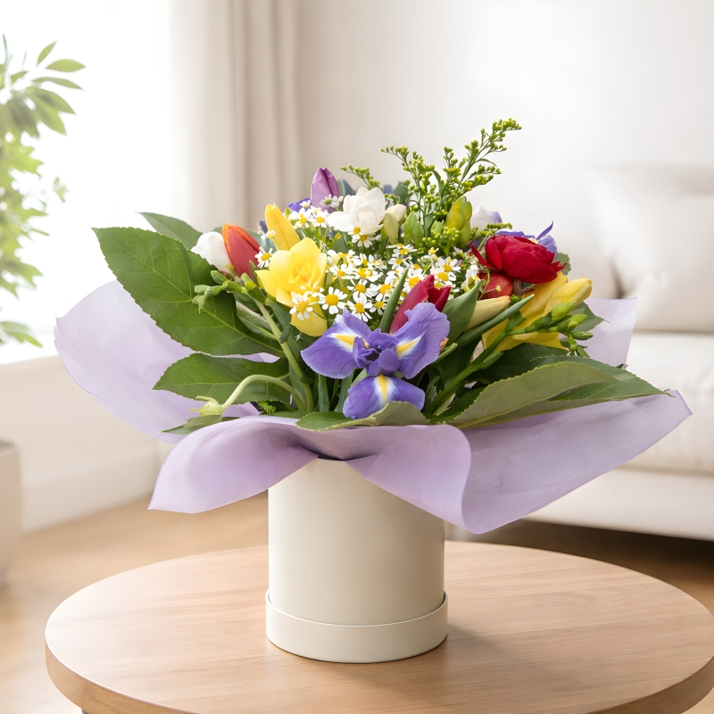 A beautiful scented and fresh mix of seasonal, spring flowers arranged in water and presented in a hat box
